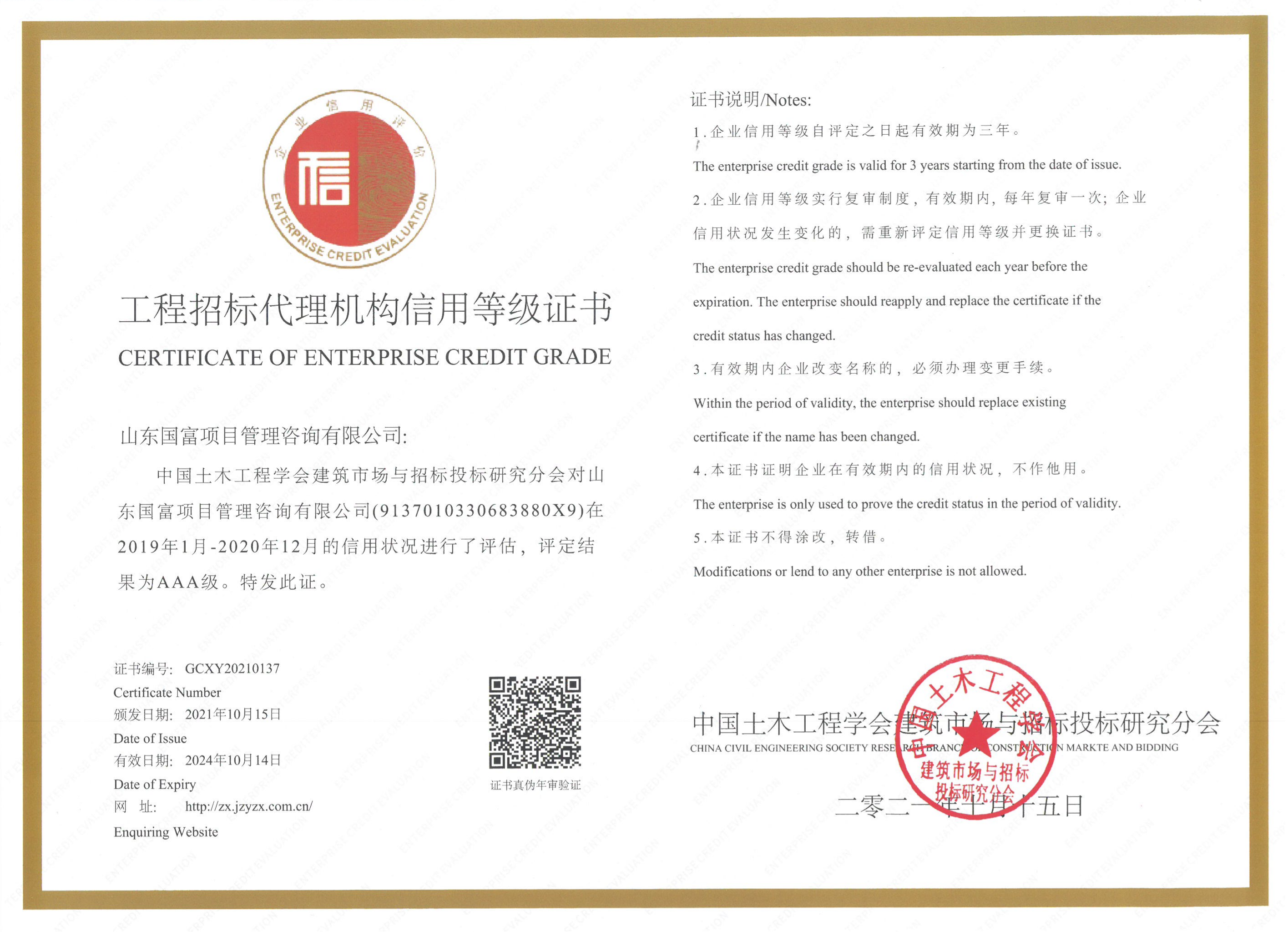 山東國(guó)富榮獲“工程招標(biāo)代理機(jī)構(gòu)企業(yè)信用等級(jí)評(píng)價(jià)AAA級(jí)”