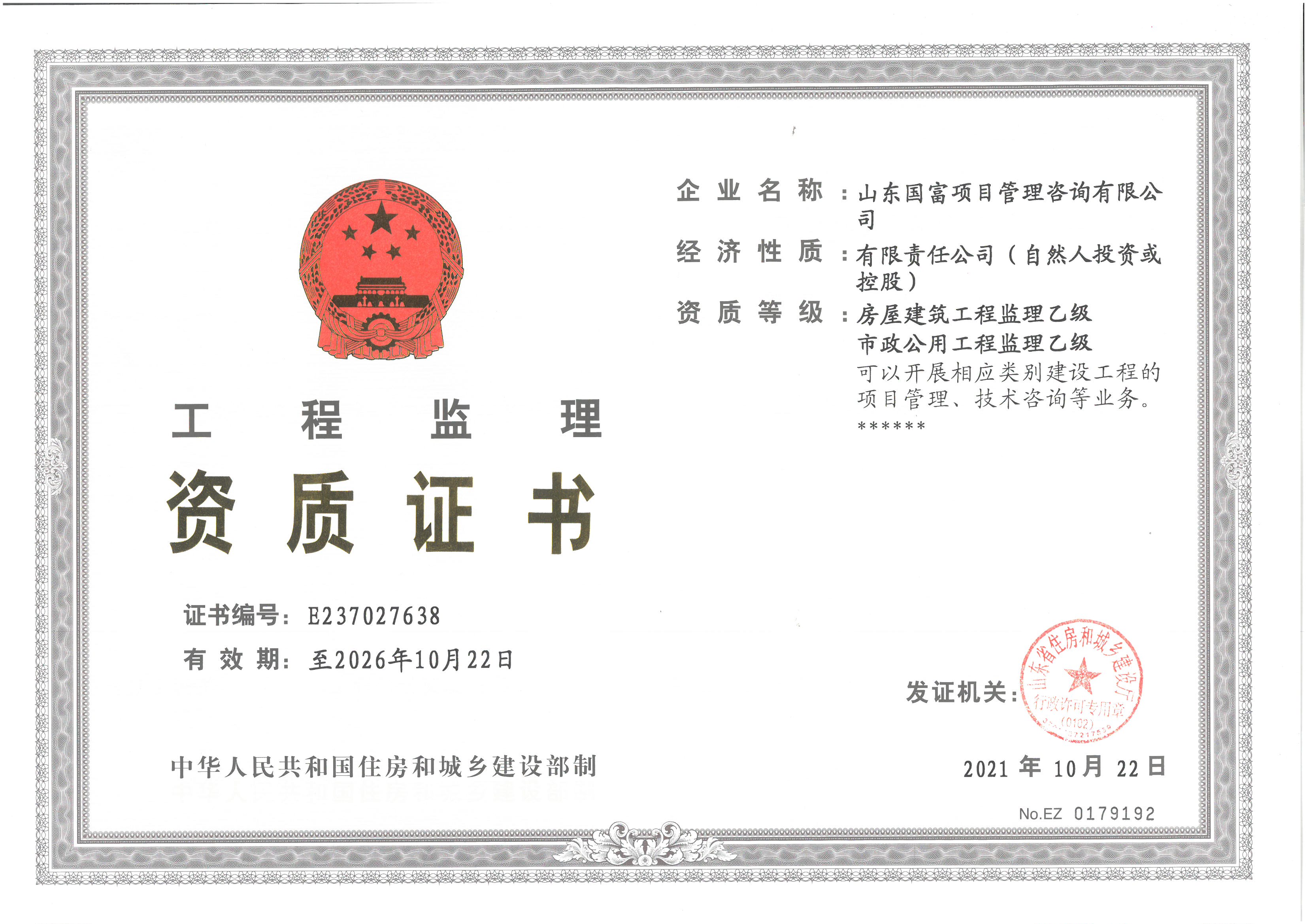經(jīng)濟(jì)南市行政審批服務(wù)局審核通過(guò),山東省住房和城鄉(xiāng)建設(shè)廳許可,山東國(guó)富獲得工程監(jiān)理企業(yè)乙級(jí)資質(zhì):房屋建筑工程監(jiān)理乙級(jí)、市政公用工程監(jiān)理乙級(jí)。
