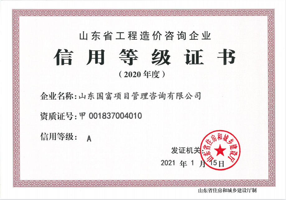 被山東省住房和城鄉(xiāng)建設(shè)廳評(píng)為:山東省工程造價(jià)咨詢企業(yè)信用等級(jí)A級(jí)
