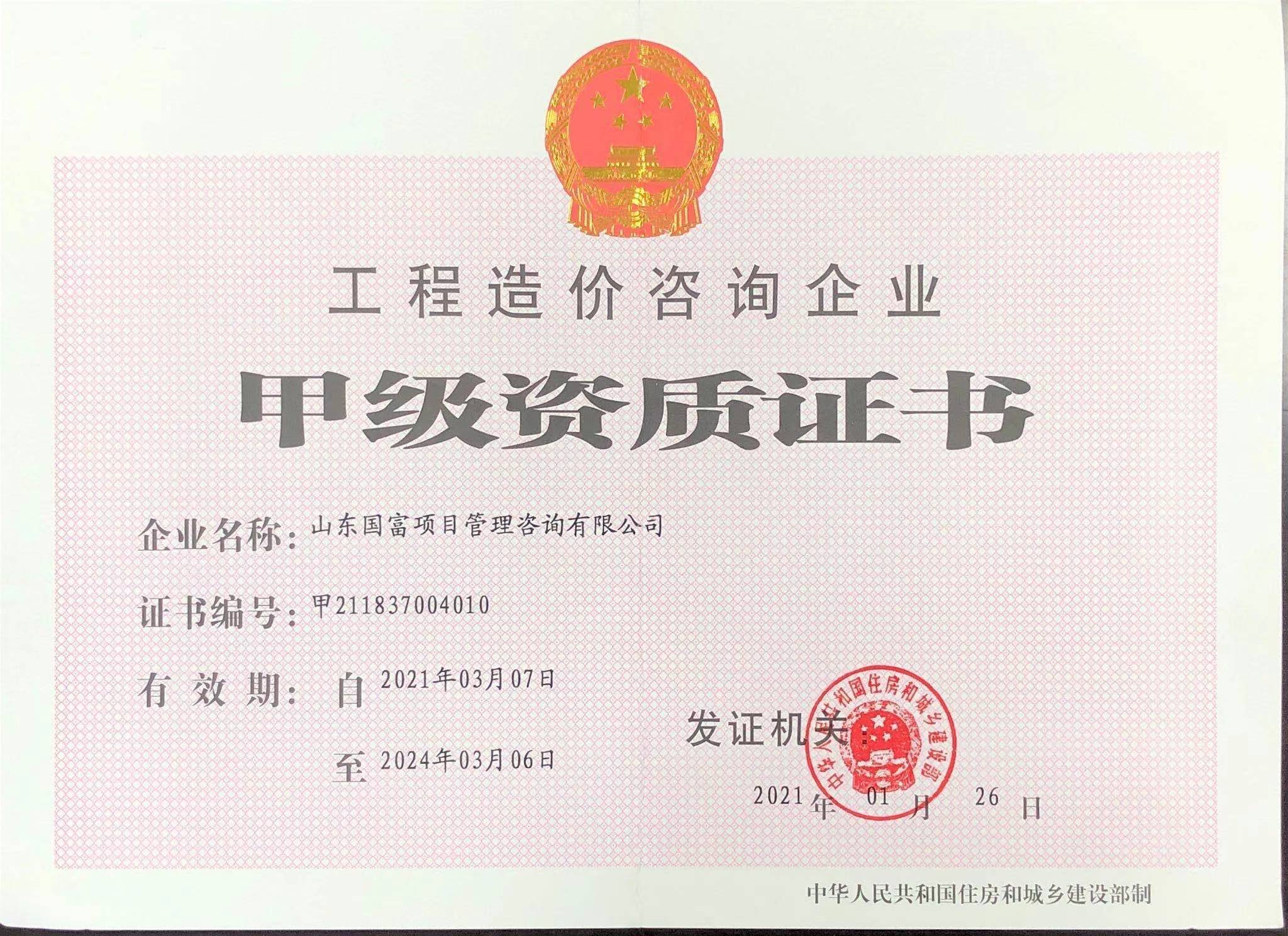 經(jīng)濟(jì)南市行政審批服務(wù)局審核通過,山東省住房和城鄉(xiāng)建設(shè)廳許可,山東國富項(xiàng)目管理咨詢有限公司獲得工程監(jiān)理企業(yè)乙級(jí)資質(zhì):房屋建筑工程監(jiān)理乙級(jí)、市政公用工程監(jiān)理乙級(jí)。